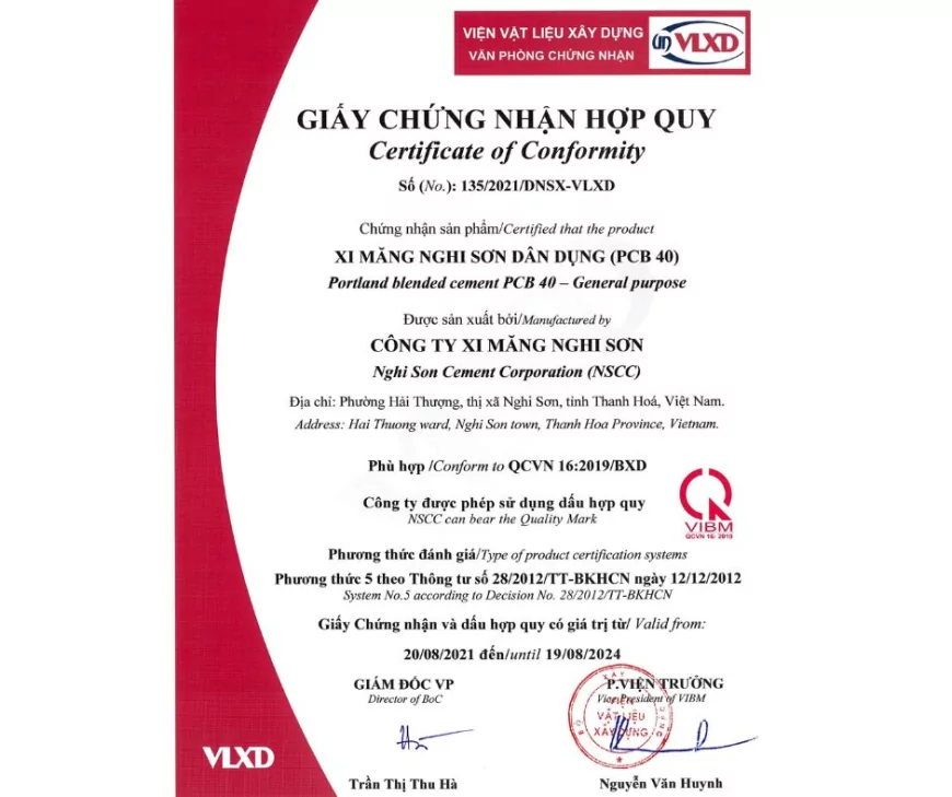 2023: Xi măng PCB40 Nghi Sơn được chứng nhận “Xi măng Xanh” bởi Viện Vật liệu Xây dựng; áp dụng hệ thống quản lý chất lượng ISO 9001 và ISO 14001. Năm này cũng đánh dấu lô hàng xuất khẩu đầu tiên sang Hoa Kỳ (31.500 tấn xi măng đến cảng Stockton).